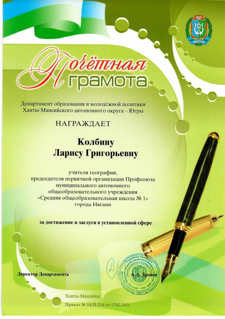 Почетная грамота ДОиМП ХМАО-ЮГРЫ