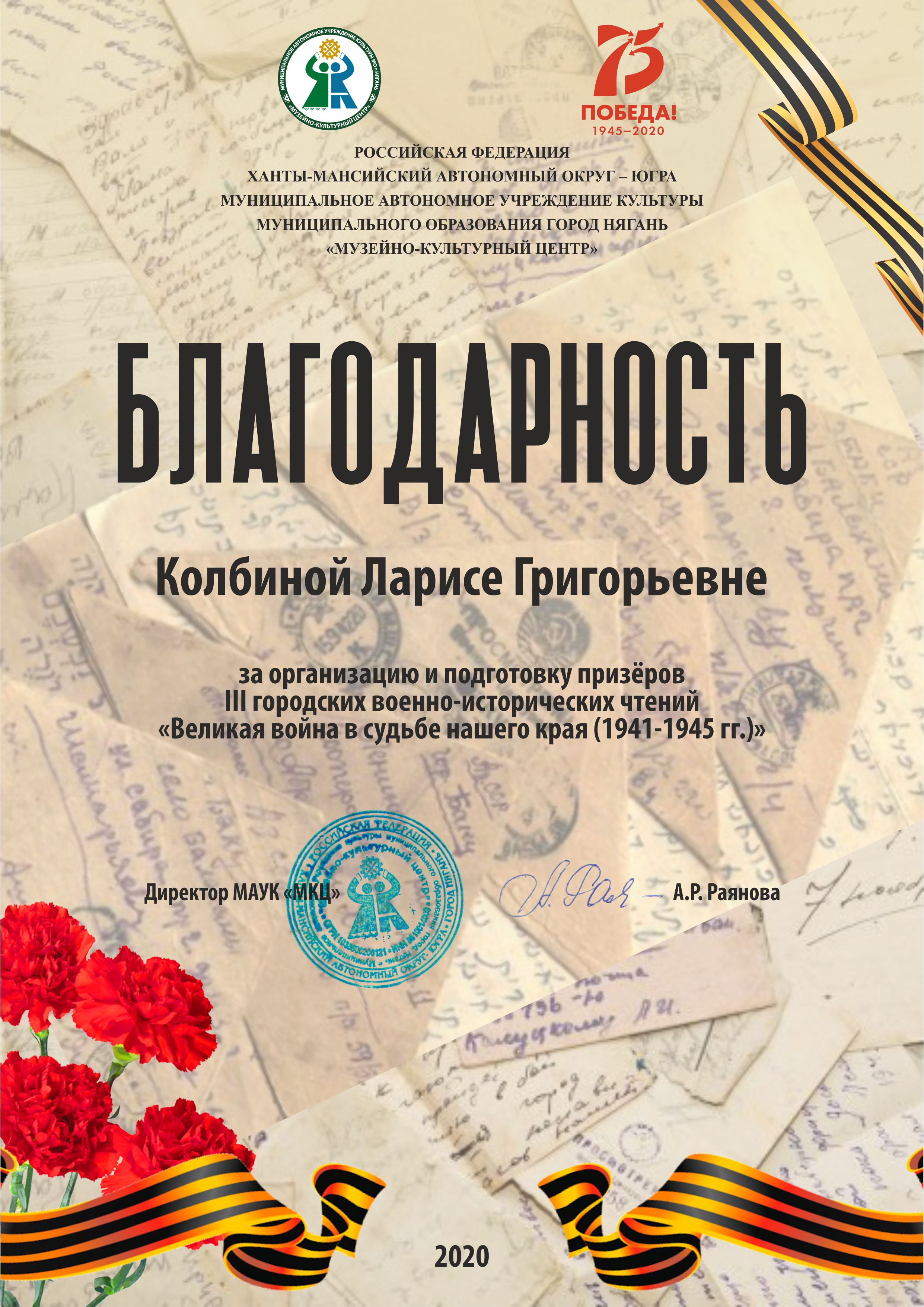 Благодарность за организацию и подготовку призеров III военно-исторических чтений