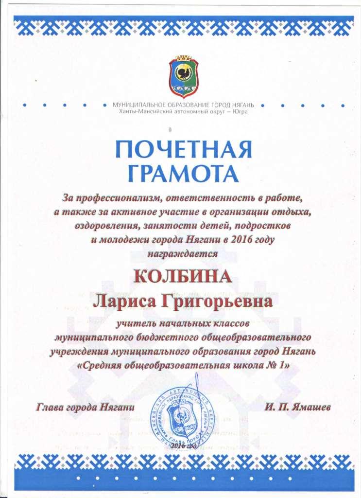 Почетная грамота Главы города Нягани