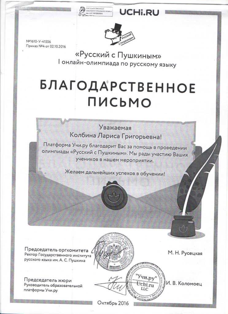 Благодарственное письмо "Русский с Пушкиным"