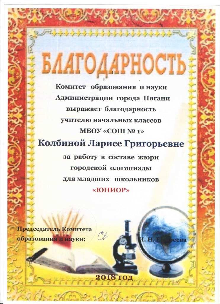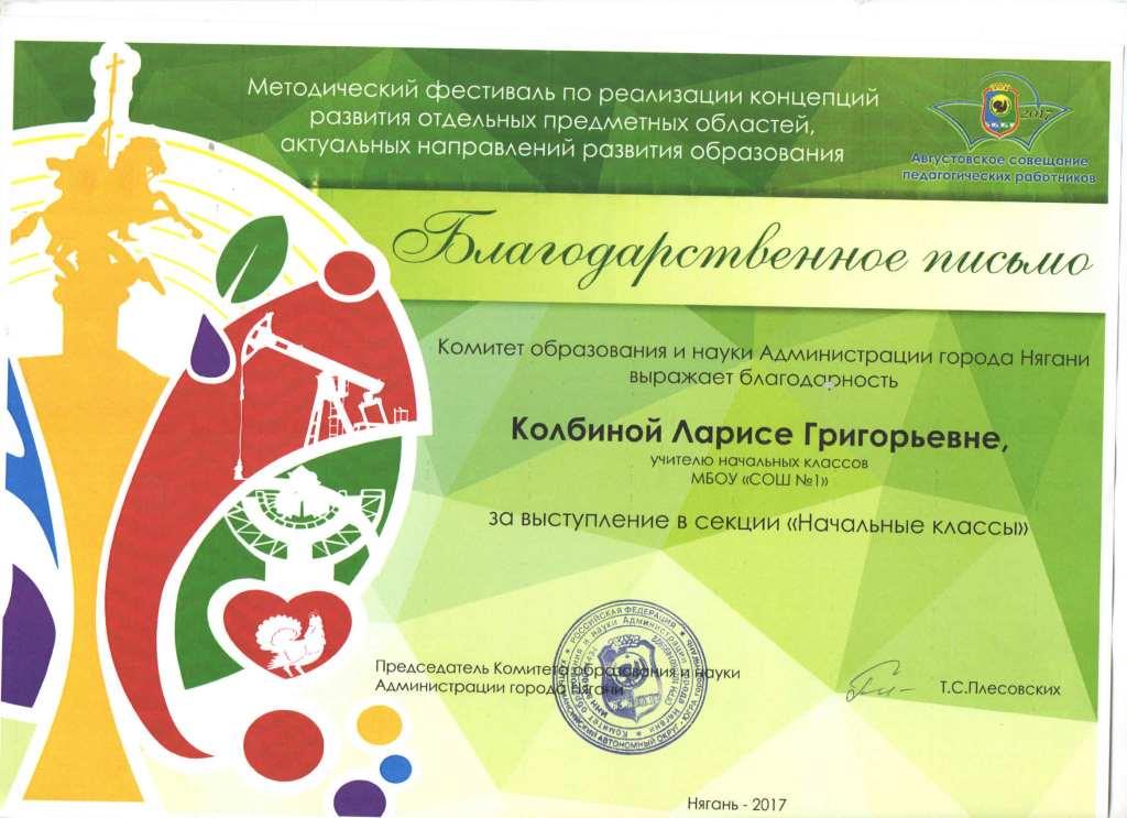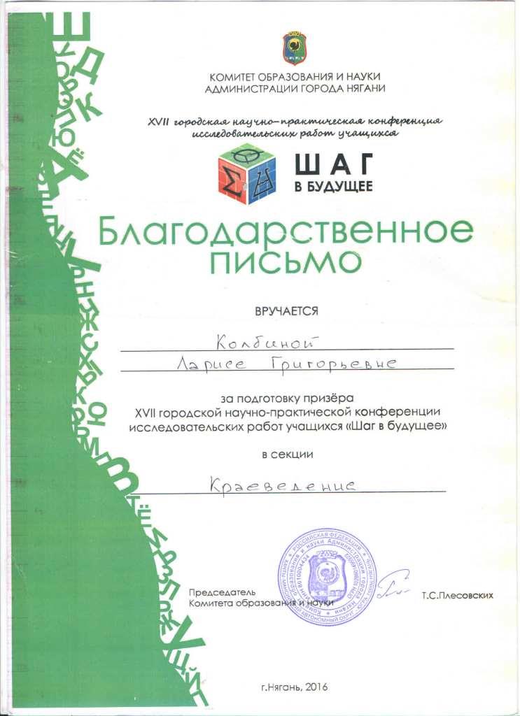 Благодарственное письмо Комитета образования и науки г.Нягани